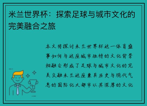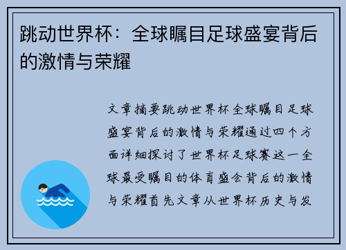 文章摘要的内容:铁窗杯世界杯:从囚笼到绿茵场 见证足球梦想与奋斗的奇迹,描绘了足球在非凡环境中的力量。这篇文章将从历史背景、心理影响、社会意义和数据分析四个方面深入探讨,展示足球如何在最不可能的地方激发梦想和希望,以及它如何在被囚禁的人们中间成为一种解放和重生的象征。1、历史背景文字阐述内容文字阐述...