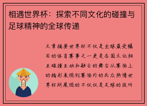文章摘要的内容:首届世界杯,从乌拉圭的辉煌到国际足球盛宴的诞生,见证了足球历史上的里程碑时刻。从比赛的起源、乌拉圭的夺冠到全球化影响,这篇文章将深入探讨这场体育盛事的重要性及其留下的深远影响。1、比赛的起源首届世界杯的举办,标志着国际足球比赛的全球化发展。从国际足联的组织到参赛国家的广泛代表,比赛的...
